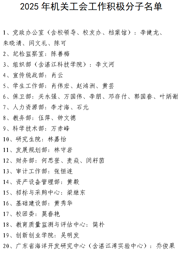 根据《关于做好2025年度工会考评工作的通知(党政办〔2025〕22号)》要求,结合机关各部门会员积极参加工会活动实际,经机关各部门工会小组推荐、所在党支部审核、机关工会研究,现将2025年机关工会工作积极分子名单予以公示。